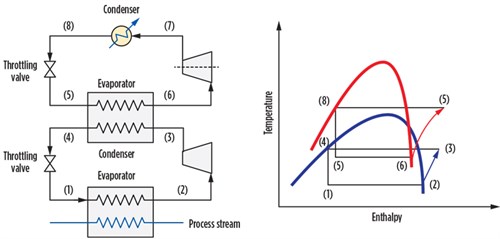 In the context of the LNG industry, the thermodynamic efficiency of the basic closed cycle can be improved by increasing the number of refrigeration stages or by using more than a single working fluid (refrigerant) in a cascade arrangement.