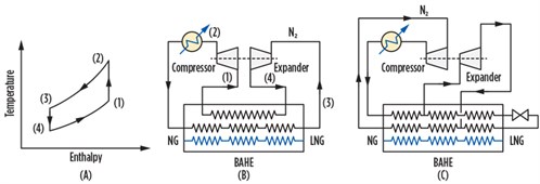 Simplicity of design and ease of implementation are the main advantages offered by the BR cycle. However, since only sensible heat is transferred, the BR cycle may be economically advantageous only for micro- and small-scale LNG production, as increasing the cooling duty would result in an increase of N₂ flowrate and a disadvantageous increase in plant dimensions.