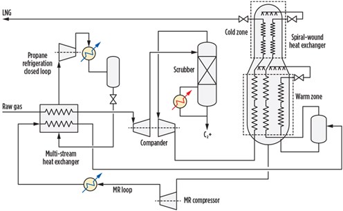 In the baseload LNG industry, the most commonly used process configuration is a combination of propane precooled and mixed refrigeration (C3MR) processes. Generally, the propane cycle includes a three-stage refrigeration system where propane is boiled at three distinct temperature levels and the boiling curve forms three distinct steps.