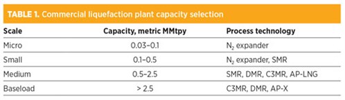 Production plants. The selection of a specific LNG production plant is driven by the feed composition, plant capacity, location, ambient conditions, safety and energy cost. As a short reference, TABLE 1 provides a list of the main commercial processes segmented according to plant capacity.