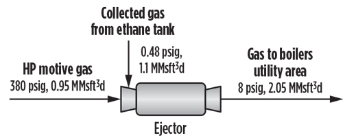 Ejector-based FGRS. The scheme was developed by utilizing a suitable ejector to collect the 1.15 MMsft3d of continuous flare gas at 0.48 psig, using 0.95 MMsft3d of available high-pressure gas as motive gas. The process scheme was modeled, simulated and confirmed possible, using proprietary software.a To this end, a recovery system utilizing high-pressure gas at 380 psig as motive gas—in an ejector to transport the gas from the flare site to the boiler utility area—was established. FIG. 2 shows the calculated flowrates and pressures for the feeds and outlet streams of the ejector. FIG. 3 shows the flow scheme for the ejector-based FGRS.