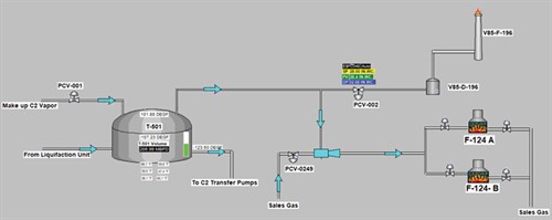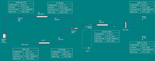The results of the hydraulic analysis indicated that new and existing pipes are of adequate size to avoid backpressure on the ethane tank under normal operation, and they are able to deliver the mixed gas stream at a pressure of 3.7 psig to the boiler skids. A sensitivity analysis, including summer and winter conditions, was also run to calculate the system pressure drop. The calculated pressure drop for the 8-in. ethane line from the tank vapor line to the ejector skid inlet is 0.1 psig. The simulation results also validate the pressure drop calculation performed by a third party.