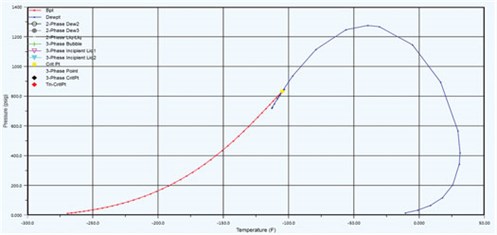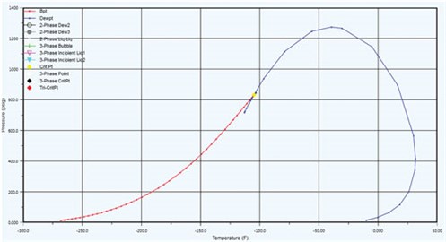 Phase envelope. Proprietary simulation steady-state softwarea is utilized to simulate the hydrocarbon dewpoint control unit. FIG. 6 reveals the phase envelope for lean sales gas after processing through a JT valve-based hydrocarbon dewpoint control unit.