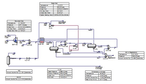 EG or methanol is injected in raw gas at the inlet of the gas/gas exchanger to avoid possible hydrate formation at low operating temperature. Rich EG/methanol solution collected from the LTS is routed to the glycol/methanol regeneration system, which, after processing, recycles back lean ethylene glycol solution to the dewpoint reduction unit.