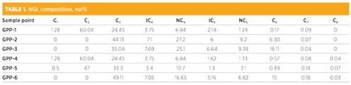 NGL composition. NGL composition was measured using a gas chromatograph equipped with a thermal conductivity detector (TCD), as well as an open tabular column of 100 m × 0.25 mm inside diameter, fused silica-coated with 0.5-micron-bonded methyl silicon. A helium carrier gas linear flow was established at 30 ml/min. Injector and TCD detector temperatures were maintained at 220°C and 250°C, respectively. The column oven temperature was programmed for an initial temperature of 70°C held for 4 min, a ramp-up to 8°C/min, and a final temperature of 200°C for 16 min. The injection volume was 1 µL.