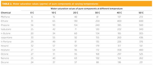 The solubility curve can guide engineers in understanding the importance of improving the existing condensate dehydration step and the selection of the appropriate technology or technologies for processing NGL. From the solubility curve, it can be seen that if the plant engineer can maintain a total water concentration of 10 ppmw or below in processed NGL, then free water formation at the pipeline will not occur even if the ambient temperature of the pipeline goes to 0°C. GP