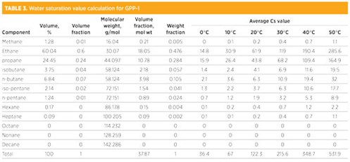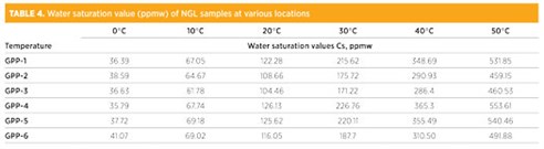 TABLE 3 illustrates the steps followed to calculate average saturation values for each component of NGL sampled from the sample point GPP-1. TABLE 4 summarizes the water saturation value of NGL sampled from various locations.