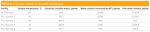 Sample from downstream of inlet separators. The condensate from downstream of the inlet separators will contain a high water content, including free and soluble water. One sample point was selected for this study at different periods of time, and the results are summarized in TABLE 6. To calculate the Cs values, the composition was obtained from gas chromatography analysis. As shown in the table, total water concentrations were varied from a few hundred ppmw up to 0.3%. For illustration, the recorded temperature of Sample 1 is 47°C; at this temperature, the total water content measured by KFT is 3,000 ppmw. The solubility curve shows that the soluble water content of this sample will be 405.5 ppmw, and the free water content will be 2,594.5 ppm.