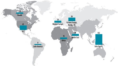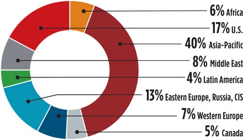 Gulf Energy Information’s Global Energy Infrastructure database is tracking more than 250 active gas processing/LNG projects around the world. At 40%, the Asia-Pacific holds the largest market share, followed by the U.S. and Eastern Europe, Russia and the Commonwealth of Independent States. Asian projects are dominated by new LNG regasification projects in China and India. Both nations are investing heavily in new natural gas import infrastructure and pipeline distribution capacity to satisfy increasing demand for industrial use and power generation. The U.S. and Russia continue to significantly increase LNG export capacity to supply developing regions with much-needed natural gas. GP