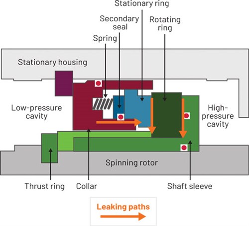 For example, FIG. 2 shows a cutaway of a centrifugal compressor on a natural gas pipeline or processing plant that uses dry gas seals. A microscopically thin film of gas provides lubrication and separation for the rotating elements. During startup and shutdown—particularly quick-stop and sudden shutdowns—the pressure and temperature of the gas film may move into the liquid phase envelope. A single, microscopic drop of fluid in the dry gas seal can destroy the seal.