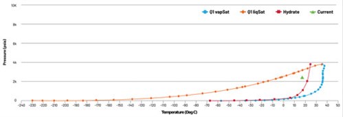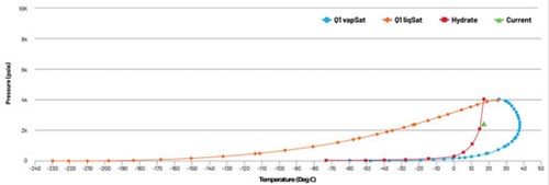 - Increase throughput—By understanding where the process is operating in relation to the phase envelope and hydrate curves, processes can be tuned to produce more output.