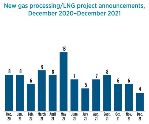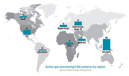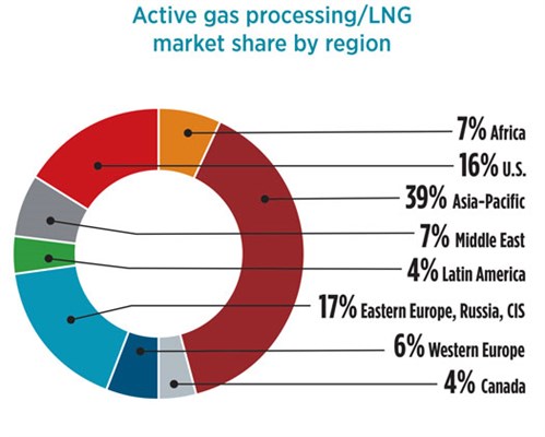 At more than 250 active projects, the gas processing/LNG sector represents nearly 25% market share in active projects globally. Most of the sector’s active projects are in the Asia-Pacific region, followed by Eastern Europe, Russia and the Commonwealth of Independent States (CIS), and the U.S. Led by capital investments in China, the Asia-Pacific region has continued to dominate in total active project market share. China, along with several other Asian nations (e.g., India), are investing heavily in new LNG import infrastructure to satisfy increasing demand for natural gas. This is being led by new government initiatives to curb carbon emissions for power generation. GP