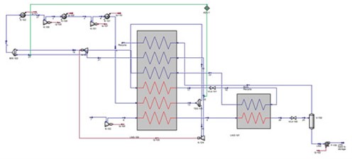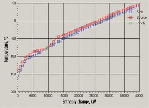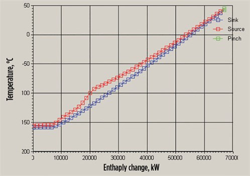 With a combined refrigerant case, a turbo-expander loop will cool, using a nitrogen feed, and a second turbo-expander loop will cool the warm end with a methane feed. The intermediary section—which requires latent heat—will be cooled with the use of liquid methane. The methane system at the cold end will use latent heat to provide the required cooling. The limitation is that methane will begin to condense in the temperature range between –110°C and –143°C (FIGS. 4 and 5). The details of this case include: