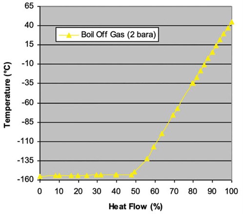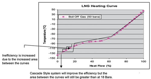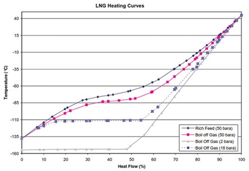 Mixed-refrigerant liquefaction systems. The LNG heating curves play an important role in the selection of the refrigerant. Mixed refrigerant would be unable to achieve cooling along the flat sections of the heating curves. When the BOG is at 50 bara, there is more curvature in the heating curve. This means that the process fluid is condensing through a wider range. For this reason, a mixed refrigerant is suitable, since the components will also condense at different temperatures. A mix of the three components (methane, ethane and nitrogen) will result in a curve that will justifiably provide cooling at the cold end of the system.
