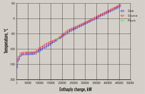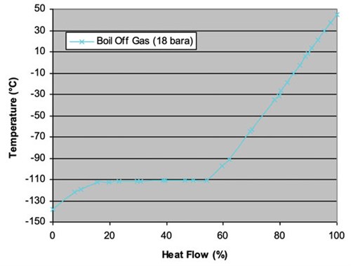 This means that methane is more efficient than nitrogen due to the molar heat capacity it possesses. This was a significant advantage, and methane was used for all warm-end refrigeration. The challenge with methane was its ability to provide sensible heat at cold temperatures below –110°C. Due to methane having a warmer boiling point than nitrogen, it was unable to effectively provide cooling below these temperatures, using a turbo-expander cycle. At 18 bara, the evaporation of methane to provide cooling was still more effective than the combined nitrogen and methane system. At 50 bara, methane was inefficient due to its inability to follow the curve at the cold end. In this case, it was advantageous to have combined nitrogen and methane systems.