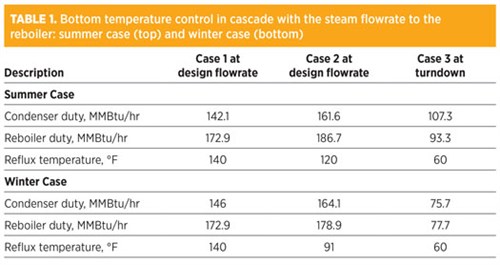 The bottom temperature control in cascade with the steam flowrate to the reboiler—shown for both the summer and winter cases—is detailed in TABLE 1.