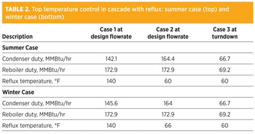 The top temperature control in cascade with the reflux—for both the summer and winter cases—is shown in TABLE 2.
