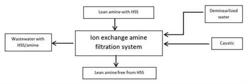 - In this process (FIG. 3), the lean amine solution is pumped into the ion exchange unit. The ion exchange resin removes the HSS, and the purified amine solution is returned to the amine circuit. After several minutes of operation, the system rinses the amine, using demineralized water from the resin, and a regeneration sequence takes place.
