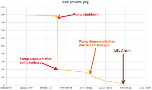 Unit A non-drive end (NDE) seal leak incident investigation. As per the provided data, the Unit A NDE seal failed after less than 1 mos of operation while the pump was not running and resulted in leakage to the atmosphere, triggering the lower explosive limit (LEL) alarm in the plant. The pump was shutdown 7 hr before the alarm. FIG. 1 shows the pump discharge pressure and the seal leakage detection from the time of the pump shutdown to the time where the alarm was triggered.