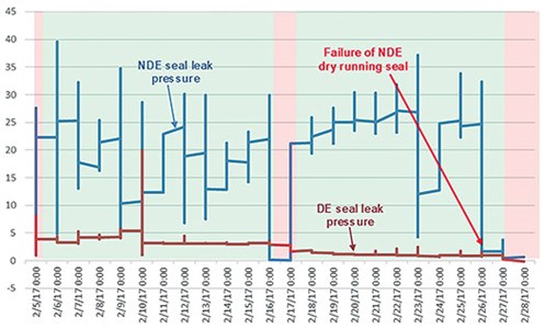FIG. 2 shows the pressure trend for the drive end (DE) and the NDE seal leakage detection pressure for the complete 23-d duration of the seal operation.