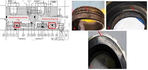 FIG. 3. The outboard mating ring showed heavy contamination and the O-ring was hardened and broken (A and B); the inboard primary dynamic ring showed excessive wear and OD chipping and contamination (C). - Contamination material was partially metallic (i.e., attracted to magnets)