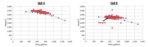 FIG. 4. Unit A and B operating flow and head. - The pumps were consistently operated between 450 gal/min and 900 gal/min (FIG. 4). As the pumps have a best efficiency point (BEP) of ~1,080 gal/min, the pumps were operated for a long time outside the preferred operating region, which ranges from 750 gal/min–1,300 gal/min. This resulted in high flow turbulence and pump vibration, significantly affecting seal life. If an increase in the current process flowrate is not expected, consideration should be given to re-rate the pumps for the actual operating condition. This will help improve pump and seal performance, and reduce pump power consumption.