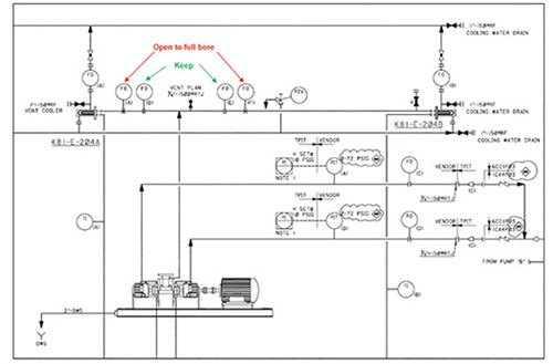 Option 1: Dual-unpressurized seal (Arrangement 2). To enhance the seal performance, remove the restriction caused by one of the two seal API Plan 21 orifices. This can be done by opening one orifice to full bore size (i.e., no flow restriction)—as indicated in FIG. 5—to avoid piping modifications that may be needed if the orifices were removed completely.