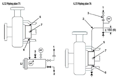 FIG. 6. API 682 seal Plan 75 and 76 configurations. Source: API. - The visual inspection of the seal auxiliary system at the plant showed that the seal chamber vent line was blinded. This means that the seal will not be properly vented, which can cause seal failures especially after pump priming. Therefore, the inboard and outboard seal vent lines must be connected to the closed drain system or the flare header to ensure venting of the stuffing box when needed. Further enhancement may be achieved if pressure indicators can be added at these two vent lines to show the stuffing box pressure. This will aid in troubleshooting future mechanical seal failures.