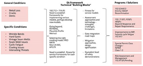 Detailed engineering and fitness-for-service evaluations will provide the best pathway forward to obtain the greatest yield from resources in terms of increasing pipeline safety and reliability and providing the largest return on investment. As outlined in FIG. 2, consistent and repeatable approaches (technical building blocks and programs) that can easily integrate and aggregate into solutions for more complex compliance and technical circumstances will serve to best support this pathway. On the left of the figure are some primary and specific conditions and threats that must be addressed. In the middle of the figure is where the technical building blocks are improved or developed. The far right of the figure shows the programs that will be constituted by a logical and pertinent arrangement of the technical building blocks to best achieve compliance and, most importantly, improve safety and reliability performance. These programs will be composed of consistent and repeatable workflows.