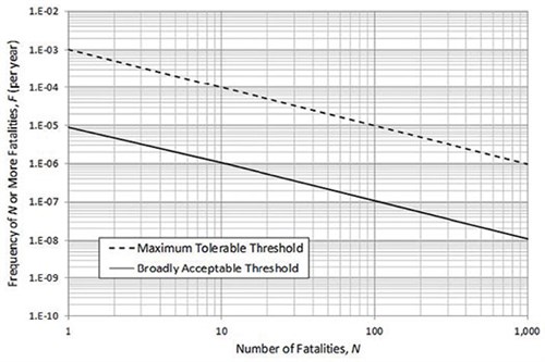 - Societal risk (i.e., a measure of the risk where the consequence considered is a function of the expected number of fatalities): The broadly acceptable and maximum tolerable thresholds are as established on an F-N curve, as shown in FIG. 4. Societal risk is typically presented in the F-N curve, which plots the cumulative frequency of events that can cause N + number of fatalities vs. number of fatalities.
