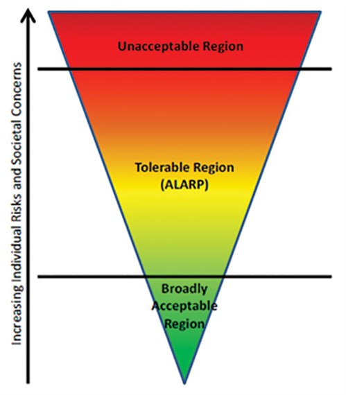 With respect to the broadly acceptable and maximum tolerable risk thresholds noted in the above criteria, the region between these two thresholds is considered tolerable risk if it can be demonstrated to be as low as reasonably practicable (ALARP), as shown in FIG. 5. The triangle represents the decreasing risk and the diminishing proportional benefit as risk is reduced.