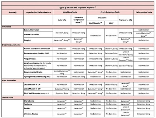 Integrity data collected from continuously evolving and improving ILI technologies will increasingly act as a key foundation for engineering assessments, including ILI tools for metal loss, cracking, mechanical damage and specific conditions (i.e., hard spots, long seam flaws and pipe movement). Therefore, it is important that the objectives are clearly defined, and that the correct ILI technology is applied for assessing the applicable threats. This includes consideration of the detection and sizing capabilities. For example, the newer-generation electromagnetic acoustic transducer (EMAT) ILI technology has evolved significantly to a point where it can play a primary role in stress corrosion cracking assessment and management programs for gas transmission pipelines. The National Association of Corrosion Engineers (NACE) International SP0102 standard,4 as referenced in the American Petroleum Institute (API) 1163 standard,5 provides guidance on proper tool selection by threat, as shown by the excerpt in FIG. 6.