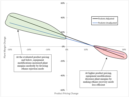 The analysis showed a modest benefit of adjusting the compressor VVPs for product pricing at or below the pricing at the time of evaluation by favoring ethane rejection mode. Above the baseline product pricing, there was a net-negative impact as ethane recovery mode is favored, and this mode is made less efficient with the proposed equipment modifications. At the time, ethane pricing was depressed but was expected to climb again, so the change was not made. Additionally, the upside in rejection mode was relatively modest. Overall, this analysis enabled DCP Midstream to make an informed decision about the equipment configuration; modifying the compressor VVPs requires a non-trivial amount of work, as well as equipment downtime. It is equally difficult to revert if prices change. By accurately quantifying the plant performance, unnecessary equipment modifications were avoided, and the appropriate business decision could be made.
