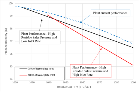 One way to visualize this effect is by plotting the propane recovery of the plant as a function of the residue gas high heating value (HHV). As the plant NGL recovery decreases, the HHV of the residue gas will increase. Ideally, most of the decrease in NGL recovery will be from ethane alone. Except in abnormal pricing conditions, maximum recovery of all other NGL components (C3+) is economically favored. Therefore, an ideal curve should be wide (indicating the ability to achieve both deep recovery and full rejection), while also being flat (increasing ethane rejection levels does not result in significant loss of propane recovery).
