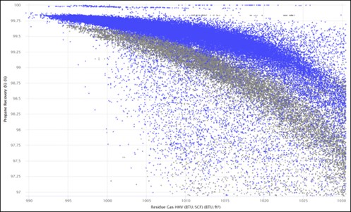 FIG. 2 shows propane recovery data for the plant over a 2.5 yr period. The gray data occurred prior to the modifications made to the turboexpander, and the blue data occurred after. Note: the residue gas HHV increases post-modification, and the propane recovery decreases less rapidly, resulting in an incremental increase in propane recovery of 0.5%–1%. Further, the minimum HHV achieved is lower, as indicated by the presence of blue data below 995 Btu/ft3 where gray data does not exist. This indicates that the full recovery condition for the plant shifted to higher levels of NGL recovery. At a large gas plant, this seemingly modest increase in recovery performance can equate to significant increases in cash flow on an annual basis.