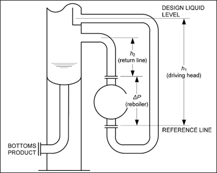 Thermosiphon loop modeling. Many NGL recovery plants operate with one or more reboilers for the demethanizer column that utilize a thermosiphon configuration. A properly designed thermosiphon loop enables flow through the reboiler and back to the tower without the use of a pump or other rotating equipment. A once-through thermosiphon operates on the principle that the density in the reboiler feed line is higher than the density in the return line due to partial vaporization in the reboiler. Therefore, the driving head (h1–h2 in FIG. 5) can overcome the pressure losses in the piping and the reboiler.