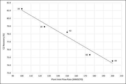 The simulation was able to quantify the decrease in maximum C2 recovery for the plant as the inlet rate increased. For all cases, the operating pressure of the demethanizer remained constant. As the flowrate increased, the load on the refrigeration system (which is modeled rigorously) increased, and the impact from the flooded bottom reboiler draw tray increased. The combination of these two factors required an increase in the temperature control set point for the bottom reboiler return to maintain NGL spec—the required temperature is indicated as a data label for each point.