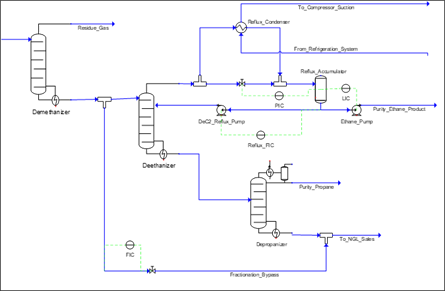 Example 2: Optimizing a fractionation train. A DCP Midstream plant consists of an NGL recovery cryogenic plant feeding a fractionation train that produces purity ethane and propane products. This fractionation train can be bypassed partially; the Y-grade is sold with the bottoms product from the depropanizer tower. However, the goal is to produce as much purity product as possible, as these streams produce higher margins than selling the components as part of a crude NGL stream. Generally, the capacity of the fractionation train is limited by the capacity of the deethanizer reflux condenser, which is a total condenser. Cooling is provided by a propane refrigeration system. The deethanizer pressure is controlled using a hot vapor bypass. A process flow diagram (PFD) of this system is shown in FIG. 7.