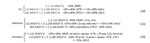 The FCI of the plant is then taken as 85% of the reported TCI. Since the cost contribution of the reforming unit varies depending on plant type, capacity, and reformer type, the authors have developed selection criteria (Eqs. 11, 12 and 13) to calculate the cost contribution of the reforming unit and to determine the technology of choice based on the processing capacity (C in MMft3d) and product type. The technology and capacity ranges for each process were estimated based on data and information from different sources, including vendors' websites,10,11 company releases,12 published reports,13 books3,4,14 and articles.15,16