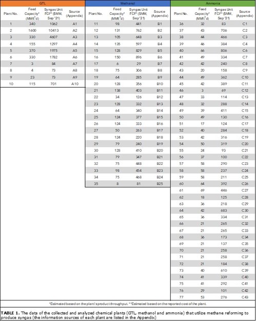 Data collection. About 85% of produced syngas is utilized in the production of chemicals and GTL. The authors surveyed and collected the economic and production data from more than 330 worldwide GTL, methanol and ammonia plants. The data of interest in this study are the capital cost, plant capacity and the year in which the plant was announced. The collected data came from multiple resources, including databases, press releases, company/vendor websites and reports. Among the 330 surveyed chemical plants, only plants that were built in the years 2000–2020 were selected for analysis to develop the cost correlation. TABLE 1 shows the capacity and cost of the selected plants. The appendix contains more information about each plant and the references.