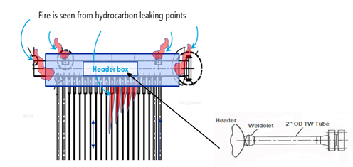 Takeaway. The operating conditions of the Platformer furnace for 5 mosprior to the incident were trended and found to be normal and within design specifications. Based on field investigations, metallurgical examinations and process parameters evaluations, the major fire was associated to rupture of a thermowell tube. This rupture was caused by leaking gas from a brittlethermowellweldolet crack. The leaking weldolet resulted in a fire inside the header box. This crack was attributed to thermal fatigue. It was noticed that thermowell tubes were installed in the middle of the outlet headers for all four CCR reforming furnaces, which is not in line with CCR licensors’ practices. These tubes were found under a restraining condition against the header box cover and associated with header thermal expansion and movement. The refinery was advised to remove the non-standard thermowell instrument tubes in the middle of the outlet headers, especially if they are not serving specific and well-known process requirements.