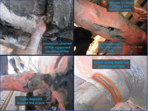 Fire at the CCR Platformer unit. On April 2, 2020, a fire was observed at the first inter-heater outlet header on the continuous catalytic regenerator (CCR) Platformer unit. The CCR Platforming unit was commissioned in 1985. There are four heaters in the Platforming reaction section. During the unit’s turnaround in November 2019, all four charge and inter-heaters were completely retubed, including the 22-in. inlet/outlet headers. The heater tubes were upgraded from T22 (2.25Cr-1Mo) to 9Cr-1Mo (T9). In addition, the new header line’s wall thickness was increased from schedule 30 pipe size to schedule 60. The materials were upgraded to overcome chronical creep and external sulfidation damages.