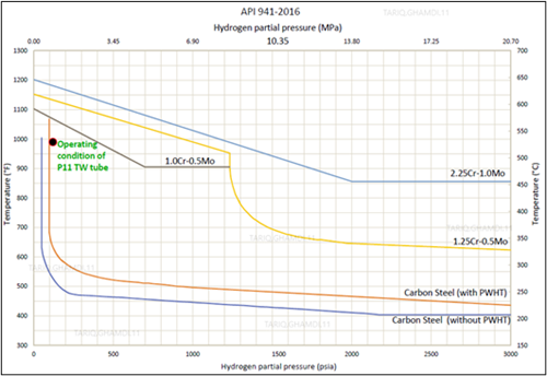 HTHA damage was accelerated by the external heat factor, resulting from the weldolet crack and subsequent leak and flame inside the fire box. Without this external heat source, this failure may not occur due to the short incubation period of hydrogen, knowing that the operating temperature and hydrogen partial pressure indicate safe operating condition, setting below the operating limits, defined by the Nelson Curve in API recommended practice (RP) 941 for P11 low-alloy thermowell tube materials (1.25Cr-0.5Mo).