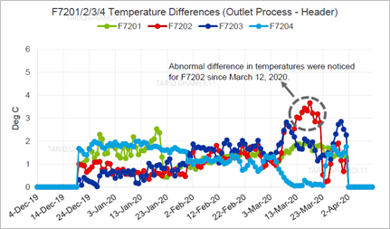 Moreover, the outlet process temperatures of the four fired heaters and the outlet process headers' temperatures were analyzed and compared. Based on the temperature trends and values, the daily difference between the outlet temperatures of each furnace and the outlet header was quite normal (i.e., 1°C–2°C)except for the defective furnace which indicated a 3°C–4°C difference. The temperature difference between the outlets fired furnace and the header line is indicative of crack symptoms inside the header's box, which likely started 10 d before the major fire, as indicated in FIG. 4.The reactors’ inlet and outlet differential temperatures were evaluated and found to be within the normal operating ranges, trending in the same manner for the entire analyzed period.