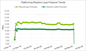 The operating pressure trends for the Platforming reaction loop were also analyzed and were within normal operating ranges. The four reactors’ differential pressures were within normal values, with no signs of pressure buildup. The reactor’s outlet pressure was maintained in the normal range of 10.3 barg–10.5 barg with no abnormalities, as shown in FIG. 5. In addition, the hydrogen:hydrocarbon ratio was examined as another process indictor and was found to be adequately maintained at around 2.6mol/mol for 4 mos prior to the date of failure.
