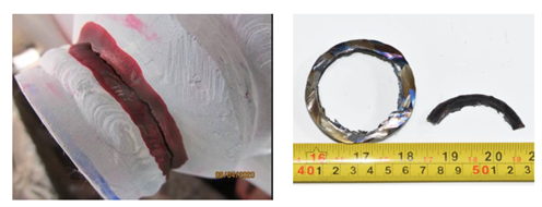 | FIG. 6. View of the weld crack (A) that extended from the 12 o’clock position to the 5 o’clock position, and the thin cut of the weld fracture surface (B), which was subjected to a metallurgical examination. |