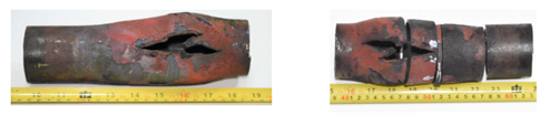 | FIG. 7. View of the ruptured tube section (A), which was cut into pieces for the metallurigical examination (B). |