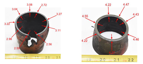 | FIG. 8. Thickness values of the 2-in. diameter thermowell tube’s (A) damaged/bulging area and away from the unaffected/bulging area (B). |