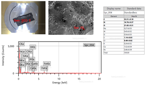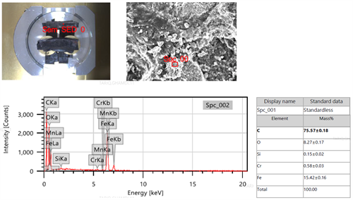 Decarburization phenomena associated with base metal thinning at the bulging area was reported, which revealeda high possibility of CH4 formation. This failure mode occuredwhen atomic hydrogen reacted with unstable carbides in the steel to form CH4 gas. The formation of CH4caused gas pockets which led to material degradation, the development of voids and catastrophic failure. This theory was supported by high carbon content—indicated on the EDS (FIG. 11)—on the fracture surface. The intergranular cracks, the macro fissuring microstructure surface decarburization and bulge along the thermowell pipe are strong evidence for the occurrence of HTHA failure.