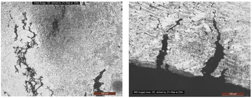 Signs of surface and internal decarburization phenomena were observed, which are indicative of HTHA. It should be noted that high temperatures and low hydrogen partial pressures typically result in surface decarburization, while lower temperatures and high hydrogen partial pressure favors internal decarburization within the wall thickness. Both conditions were observed, which may imply to non-consistent operation conditions. With time, CH4 pressure still increased at preferential sites at a rate that depends on carbon activity and temperature. Increasing pressure promotedthe extension of defects and appearance of macro cracks or fissures. Intergranular branching cracks and connecting cracks were also observed.